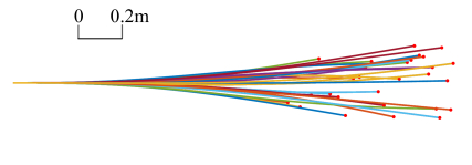 For qualitative analysis, heat maps showing the distribution of all footsteps along the trajectory are presented. The warmer the color, the slower the car moves. The values of the pixels are normalized inside a heat map; therefore, the colors of the pixels are only meaningful in a relative sense. In the "Cross" scenario, the red car tries to turn left. Because it cannot cross in front of the blue car in advance even at its maximum speed, it moves slowly and speeds up after the blue car crosses. As there is much space for the turning, the auto-driving car goes through different trajectories, while the human-driven car insists on a similar compliant route according to the driving experience in real world. In the "Overtake" scenario, the red car tries to pass a slow car (in blue), while in the "Bypass" scenario, the red car passes the blue car moving in the opposite direction. Similarly, the trajectories of the auto-driving car vary while the trajectories of human-driven car show consistent patterns. The auto-driving car is not programmed to obey the traffic conventions. More specifically, the lane changes to the right are performed at different locations in the "Overtake" scenario; in the "Bypass" scenario, though it has a tendency to travel to the right due to the motion of the other car, it moves more freely as there are no rigid confinements except the black line. In the "Follow" scenario, the red car has to travel through a narrow passage with the blue car moving in front, so it has to follow the blue car as there is no room to overtake it. In the "Wait" scenario, the blue car enters the narrow passage first, and the red car has to wait for the blue car to exit, otherwise the two cars will collide in the passage. From the heat map, we can see that the speeds of the red cars are uniform along the way for the "Follow" scenario, and both the auto-driving and human-driving cars accelerate after passing the passage area. In the "Wait" scenario, both the auto-driving and human-driving cars wait at the entrance of the passage. However, the auto-driving car is more conservative and it waits farther away for the entrance to the narrow passage.