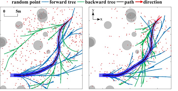 To show the effectiveness of the GMM sampling, we compare the GMM sampling and Random sampling method in the same condition. As shown in Fig.8, the goal point is (20,20, ) and start point is (0,0, ). The obstacles are 15 randomly generated disks with radius in the range of [0.5,2.0]. Given the same start pose and goal pose as well as the same environment, the sampling points of the GMM sampling are more concentrated on the adjacent region of the final path, while the points of random sampling spread in the space and cause a bigger tree and longer path. As the grown trees are also influenced by the pose difference between the start point and the end point, we test the planner with different sampling methods and different starting poses. Fig.8(b) shows the statistical results of the number of nodes, planning time and path cost with different start angles of 313 runs. It is clear to see the reduction of nodes for the GMM sampling methods. But this reduction of sampling nodes does not necessarily lead to a reduction in time as the method can not reduce the times of optimization, which contributes to a large proportion of the planning time. Note that planner with GMM sampling plans shorter path than with Random sampling in all cases. GMM sampling reduces the cost when there is a large heading difference between the start and goal.